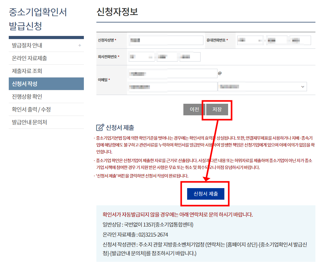 신청자정보 내용 확인 후 저장 및 신청서 제출
