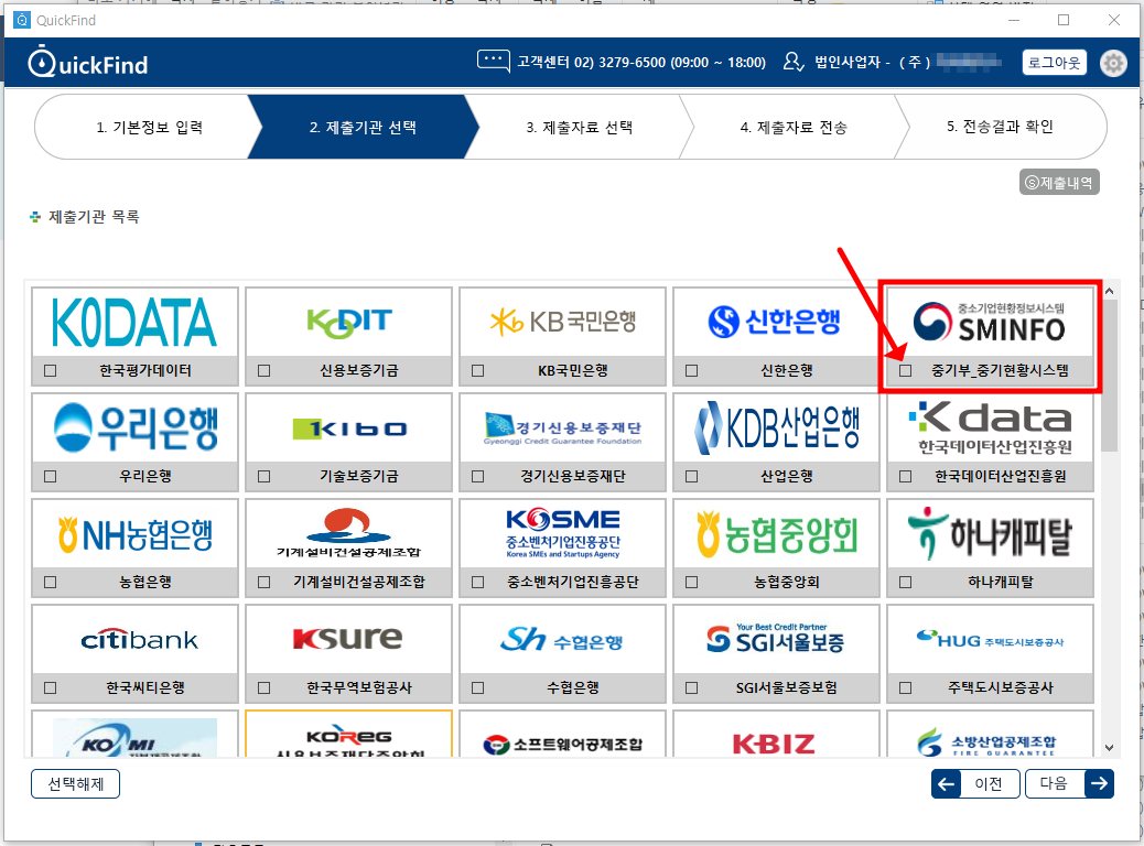 제출기관 선택이 나온다. 여기서는 ''중기부_중기현황시스템' 선택 후 다음