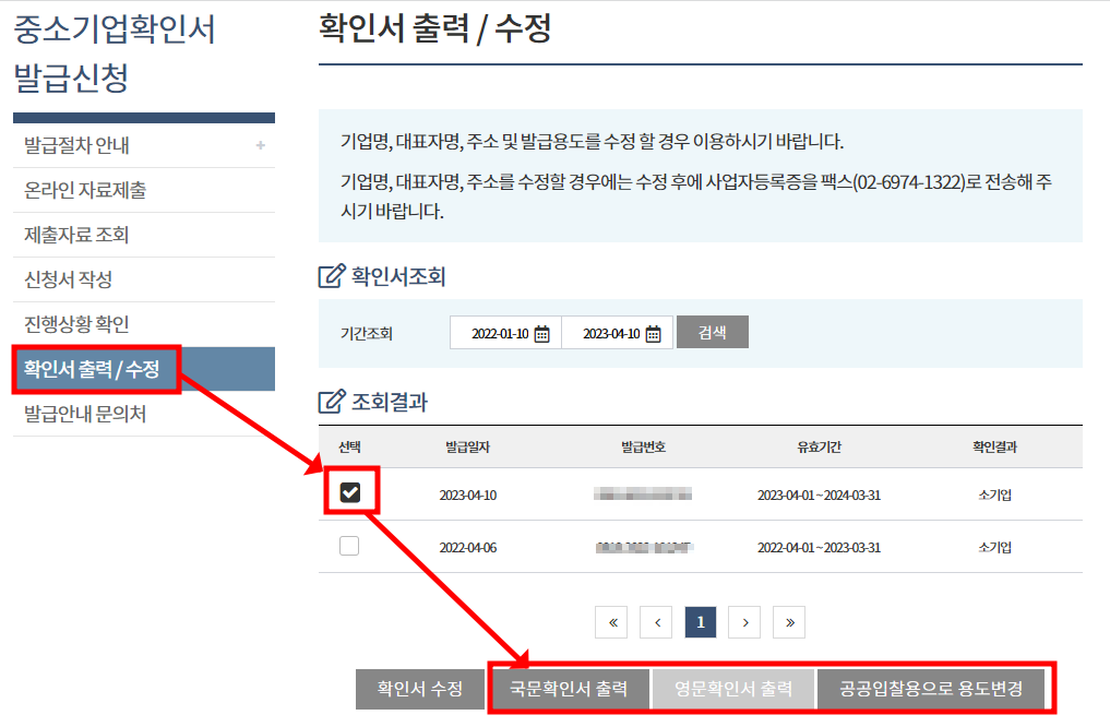 이렇게 하면 올해(내년3월까지) 사용 할 수 있는 중소기업 확인서를 출력할 수 있게 된다.