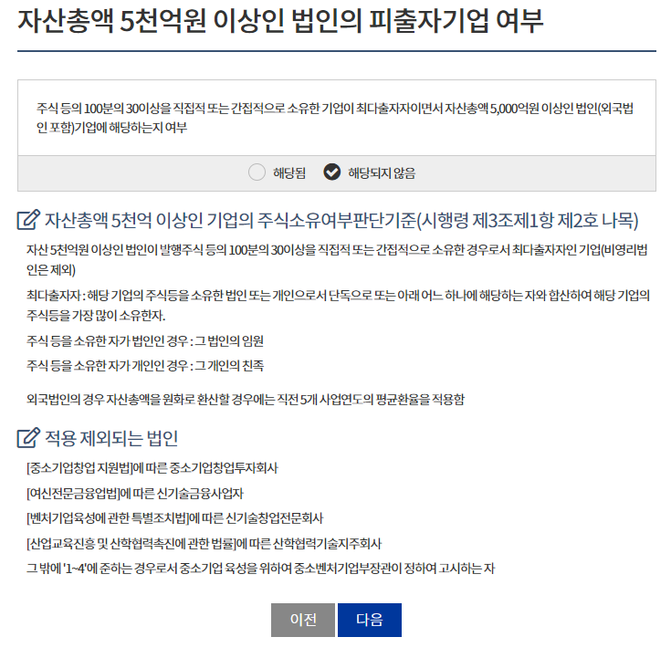 - 자산총액 5천억원 이상 법인의 피출자기업 여부 > 아래 상세히 설명되어있으니 해당되는 것 같으면 잘 읽어보도록 한다.