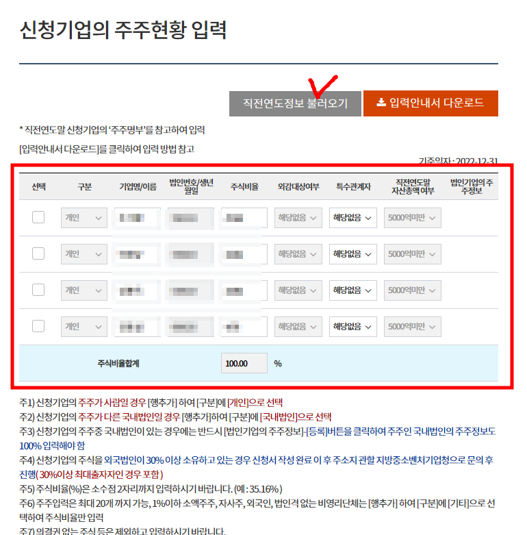 주주현황 입력은 작년에 신청했었고 변동이 없으면 편하다. '직전연도정보 불러오기' 활용.