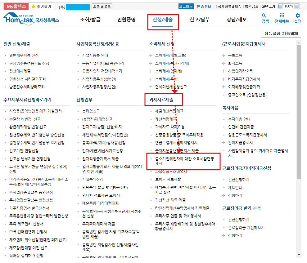 02. 상단 메뉴 > 신청/제출 > 과세자료제출 > 중소기업취업자에 대한 소득세감면명세서 클릭