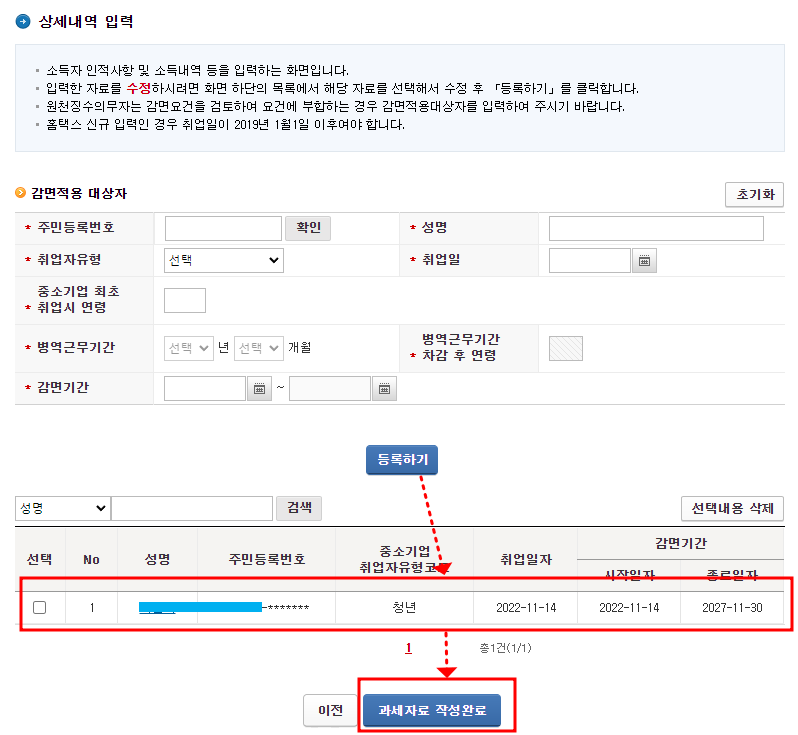 05. 상세내용 입력 > 감면적용 대상자 정보입력 후 등록하기 클릭