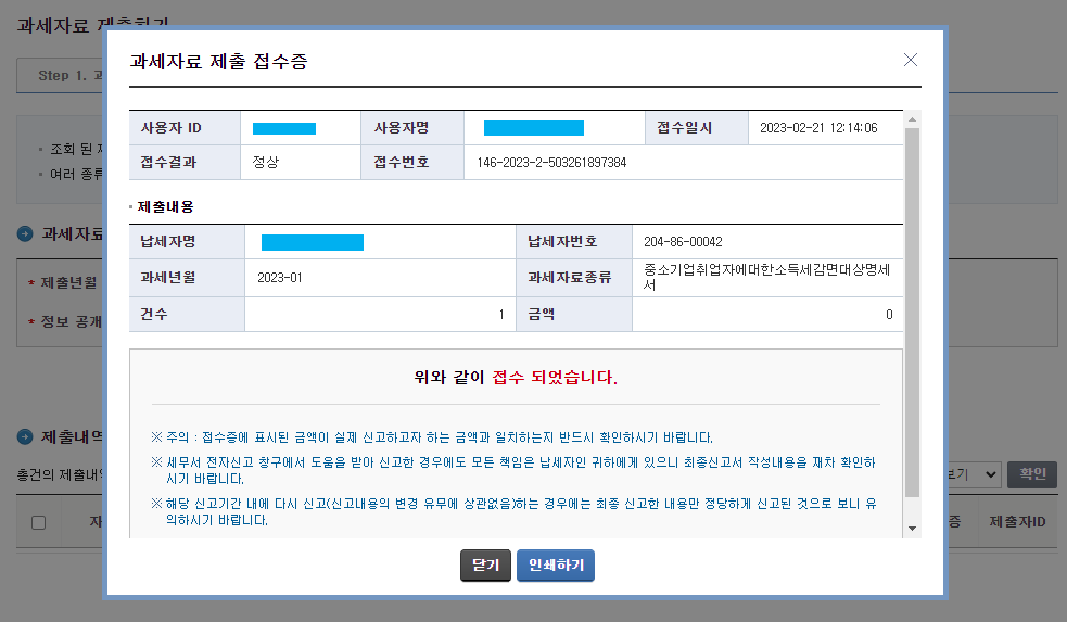 08. 과세자료 제출 접수증 / 완료 및 인쇄 > 끝!