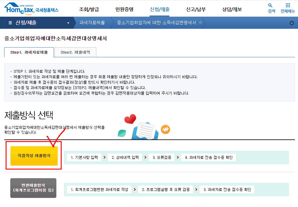 작년(2022년)까지는 세무사사무실에 관련서류 제출하면 검토 후 팩스접수로 처리해줬는데 올해부터는 방문 및 우편 혹은 인터넷으로만 가능해서 직접 신청하고 명단만 세무사사무실에 전달하기로 한다.