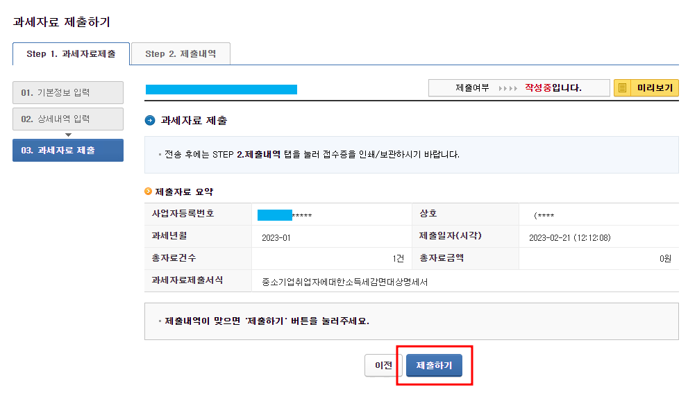 07. 과세자료 제출 > 내용 확인 후 [제출하기] 클릭