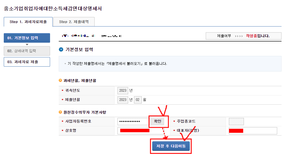 04. 기본정보 > 사업자등록번호 확인 클릭 및 '저장 후 다음이동' 클릭