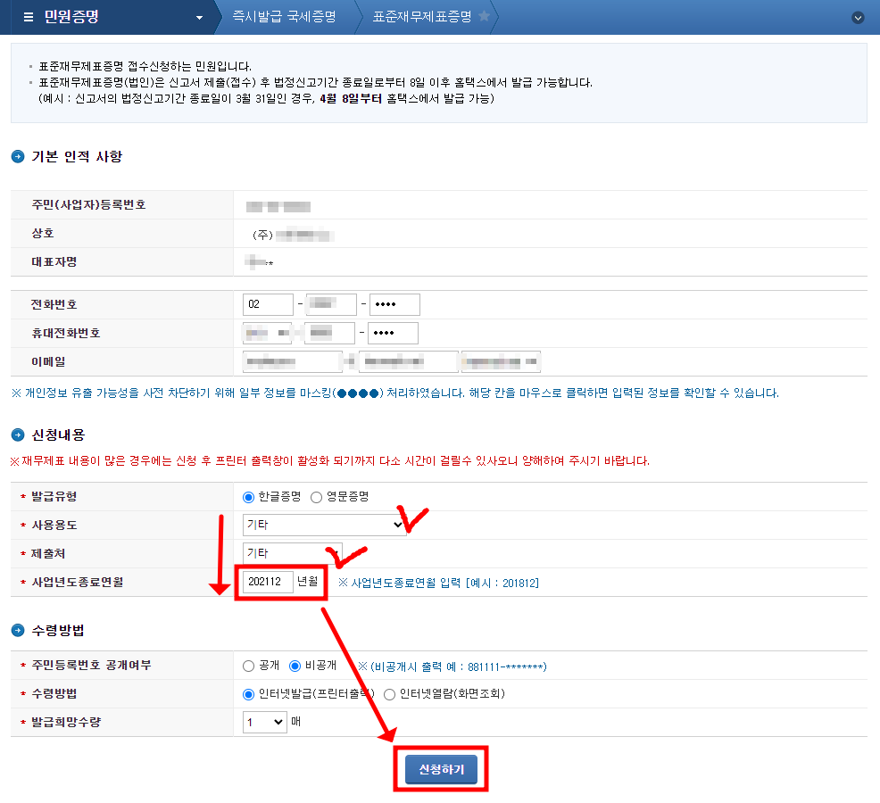 출력구분 열람용 > 결산년도 선택 후 [발급신청] 클릭