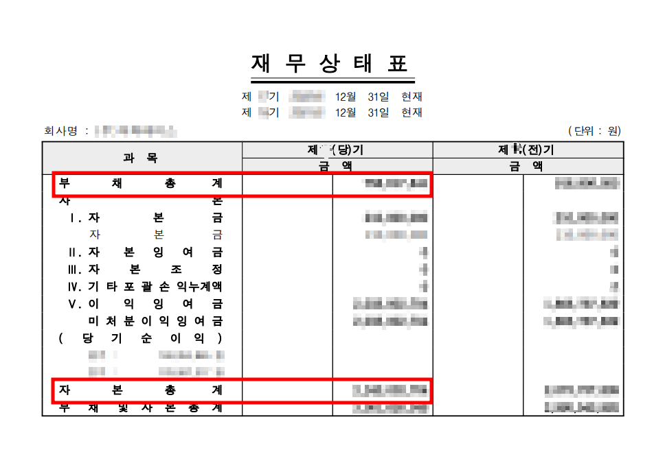 부채비율은 재무상태표 상의 [3.부채총계]를 [4.자본총계]로 나누면 된다.