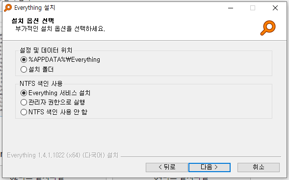 > Everything 프로그램이 빠른 검색결과를 제공하기 위해 모든 NTFS색인을 사용하고 그에 대한 정보를 db에 저장한다. 그 db파일과 설정 관련 파일을 저장하는 경로를 선택하는 곳이다.
